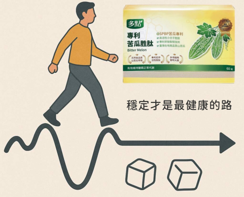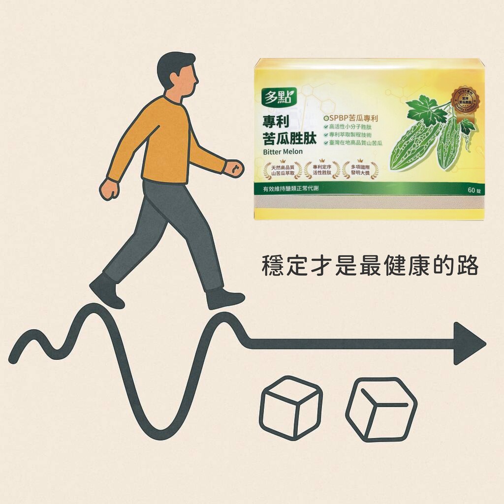 苦瓜胜肽、薑黃、牛蒡、土肉桂、鉻酵母、綠咖啡等六大穩定因子一起協同作用,讓健康指數保持平穩,不再忽高忽低,擺脫上上下下難以控制的情形。