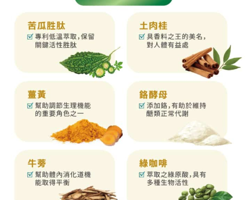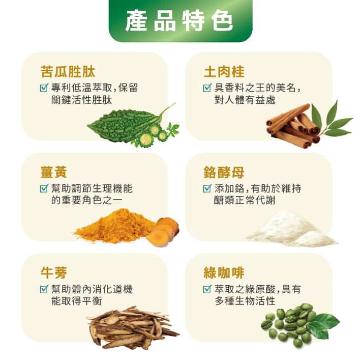 苦瓜萃取粉、土肉桂葉粉、薑黃萃取粉、綠咖啡豆萃取粉、牛蒡萃取粉、鉻酵母