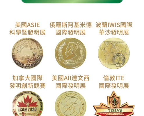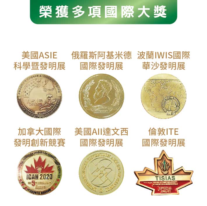 榮獲美國ASIE科學暨發明展、俄羅斯阿基米德國際發明展、波蘭IWIS國際華沙發明展、加拿大國際發明創新競賽、美國AII達文西國際發明展、倫敦ITE國際發明展等多項大獎。
