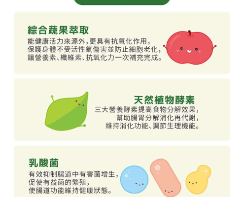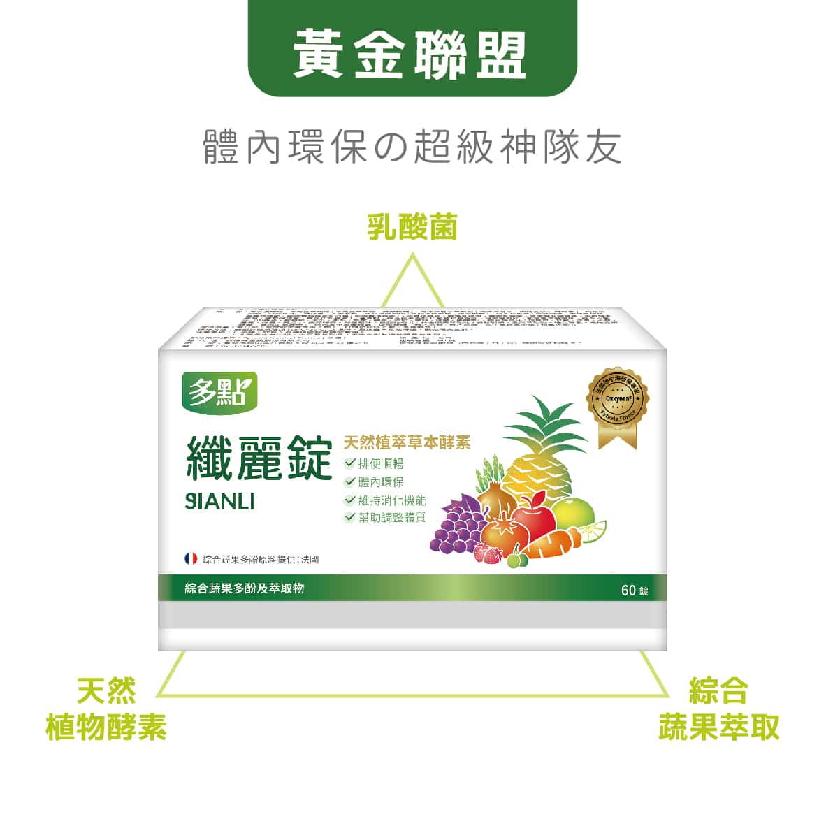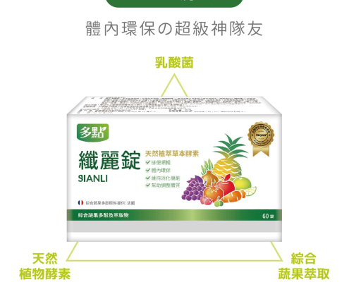 鳳梨萃取物、青木瓜萃取物、葡萄籽萃取物搭配纖維分解酵素、糖化酵素以及草莓、蘋果、櫻桃、柳橙、花椰菜、甘藍、蘆筍、橄欖、苦瓜…等綜合水果汁、蔬菜汁做成的纖麗錠,讓消化機能動起來。