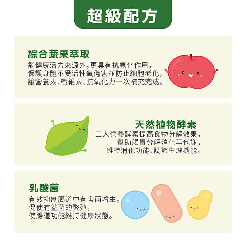 海水濃縮物、羊角豆萃取物(羊角豆萃取物、麥芽糊精)、海洋深層水萃取粉(海洋深層水、微結晶狀α-纖維素)、阿拉伯明膠、微結晶狀α-纖維素、大麥草粉、決明子萃取物(決明子萃取物、麥芽糊精)、綜合益生菌[麥芽糊精、嗜酸乳桿菌、長雙歧桿菌、動物雙歧桿菌乳亞種(動物雙歧桿菌)、短雙歧桿菌、乾酪乳桿菌、植物乳桿菌、鼠李糖乳酸桿菌、副乾酪乳桿菌、嗜熱鏈球菌、羅伊氏乳桿菌]、蘆薈粉、綜合蔬果多酚[(葡萄籽萃取物、綠茶萃取物、葡萄果渣萃取物、綜合水果汁(山桑子、葡萄柚、木瓜、鳳梨、草莓、蘋果、杏桃、櫻桃、柳橙、黑醋栗)、綜合蔬菜汁(花椰菜、甘藍、洋蔥、大蒜、蘆筍、橄欖、黃瓜)、麥芽糊精、胡蘿蔔汁、番茄乾粉)]、綜合蔬果取物(麥芽糊精、鳳梨萃取物、糖化酵素、纖維分解酵素、青木瓜萃取物)、羥丙基甲基纖維素、硬脂酸鎂、聚乙二醇[聚乙二醇、二丁基羥基甲苯(抗氧化劑)]