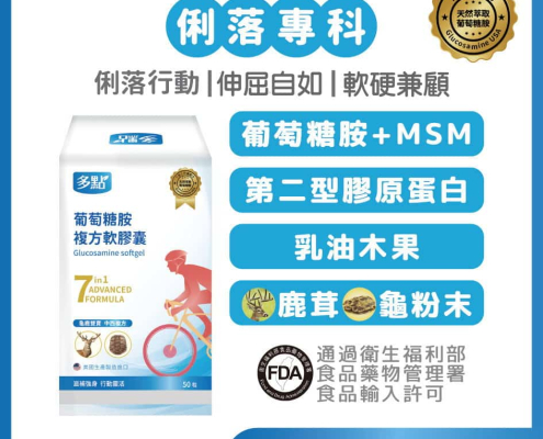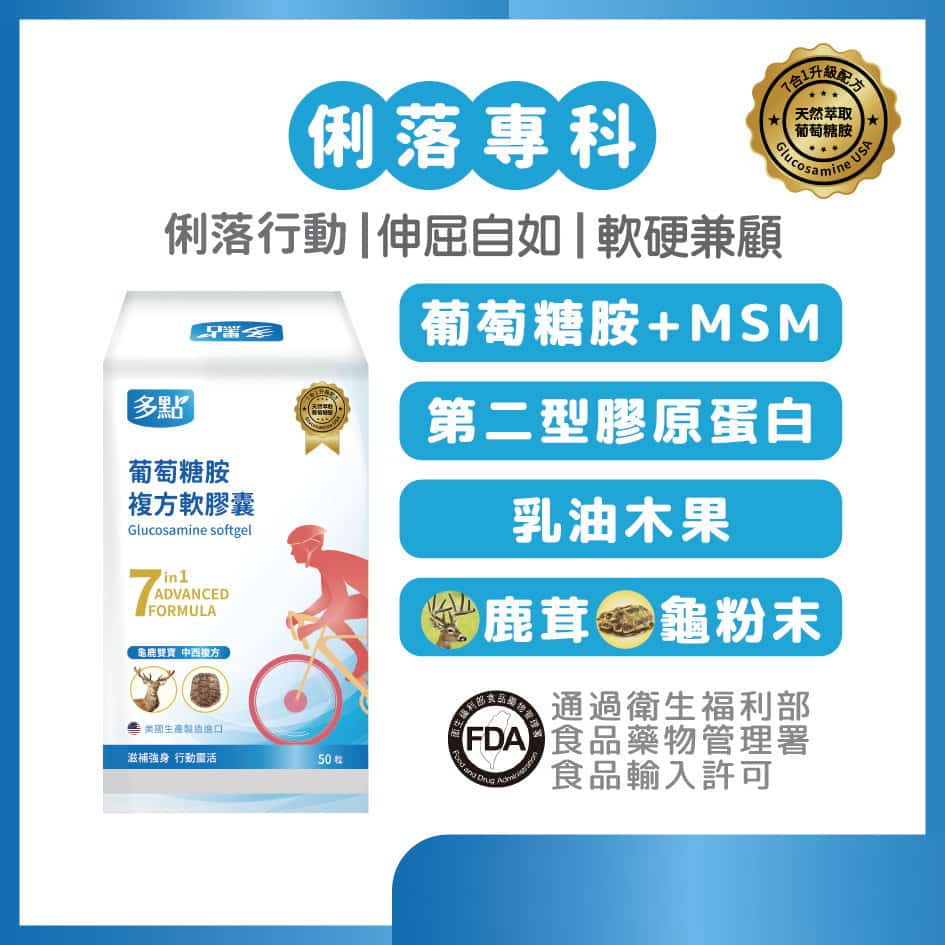 多點葡萄糖胺複方軟膠囊不僅含有龜鹿雙寶,更是7合1最給力的中西複方保健聖品,做成軟膠囊,易於吞服、保存容易、出外旅遊攜帶方便。
