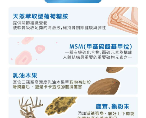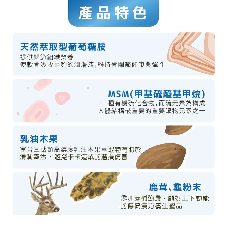 龜粉末和鹿茸融合天地之氣,膠原蛋白讓軟組織和硬架構緊密結合,葡萄糖胺和鯊魚軟骨粉像加了彈簧片來調節壓力,乳油木果如同潤滑劑,讓活動更加靈活順暢,MSM避免緊繃卡卡的磨損。